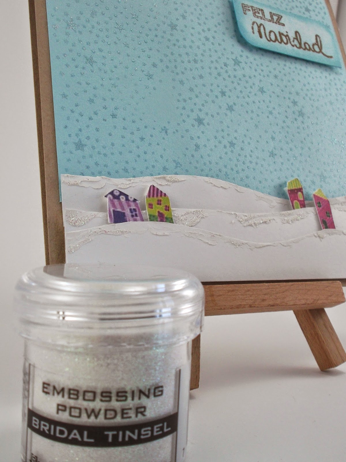 Pero, como os he dicho, les di un segundo uso a estos polvos de embossing. Para conseguir el efecto nieve, como no tenía la pasta de relieve que ya da ese efecto, se me ocurrió usar pasta de relieve normal y espolvorear con los polvos. En este caso dejé secar "al aire" en lugar de usar la pistola de calor, porque no quería que fuesen a salirle burbujas a la pasta al calentarla. Aunque no quedó mal del todo, creo que para la próxima mezclaré un poco de pasta con polvitos antes de aplicarla a la zona donde quiera conseguir ese efecto. Ya os contaré cómo queda.