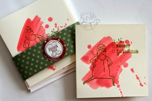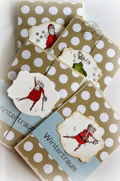 También podemos hacer un set de tarjetas tamaño estandar. Para este set también usé mis sellitos de "Visions of Santa" porque los encuentro muy graciosos. Papá Noel, haciendo ejercicios, o bailando en pijama, hasta el reno enpijamado! jajaja