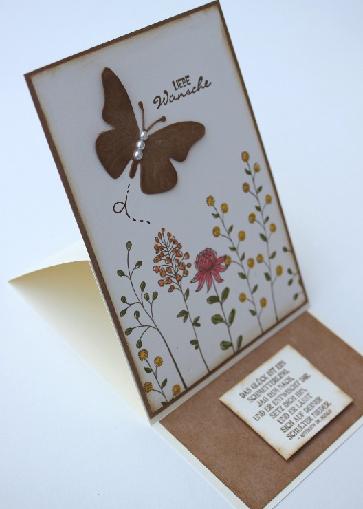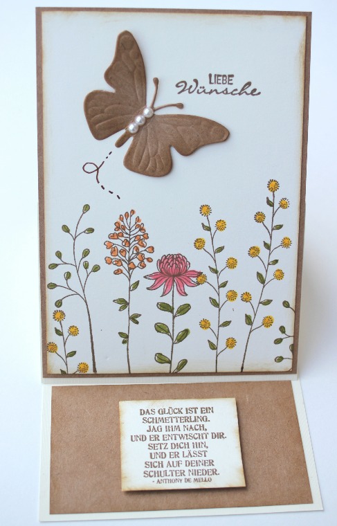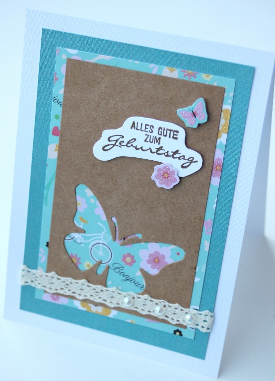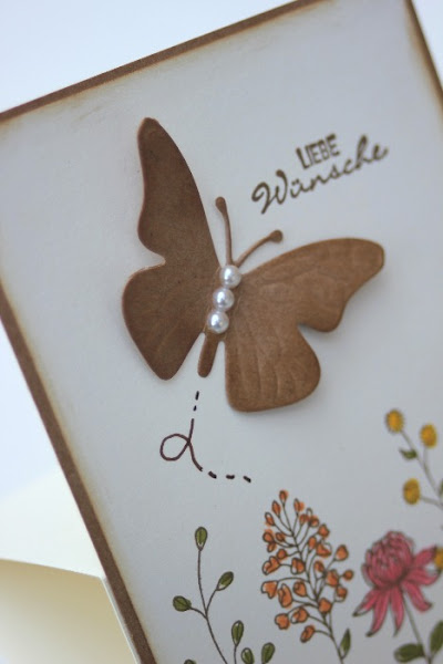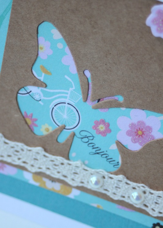 Creo que entre todo, el detalle es lo que más cuenta, una florcita allí, una perlita allá... aquí una mariposa con sus alas al aire, en cartulina craft, y qué crees? he usado el resto del papel para otra tarjeta: