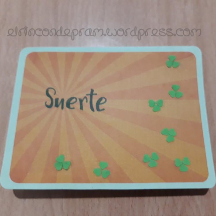 La siguiente es una felicitación de buena suerte. Para hacerla usé un papel decorado con un centro de atención dónde escribí el sentimiento imitando una tipografía. Los tréboles son corazones pegados de tres en tres.