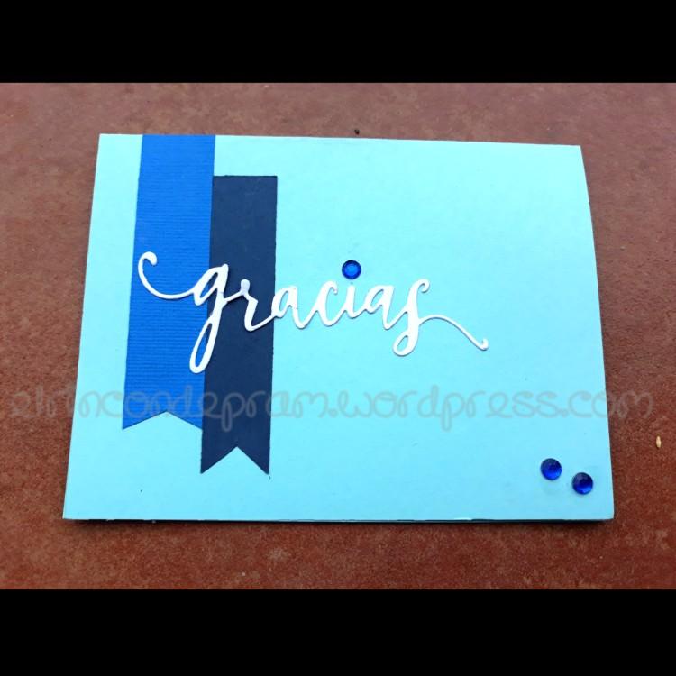 Para la primera simplemente corté dos tiras en forma de banderín y sobre ellas pegué la palabra “gracias” troquelada. Como siempre se me pierde el punto de la i, lo hice con una piedra adhesiva y añadí otras dos para adornar.