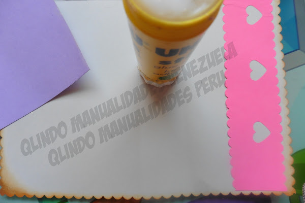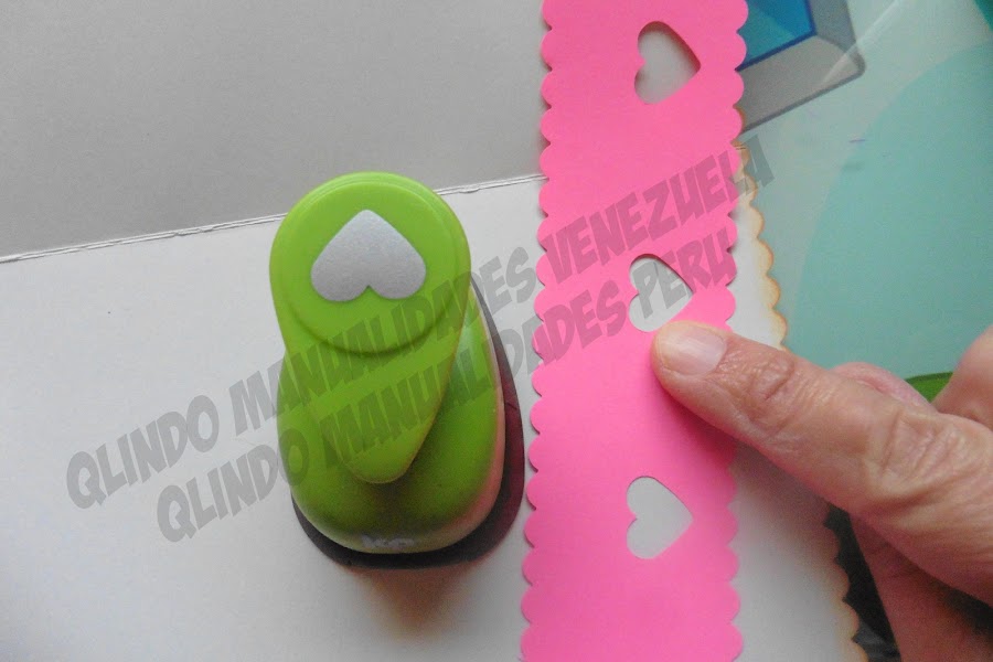 8. A continuación cortamos una tira del largo de la base de tarjeta, en este caso yo la corte en papel fucsia y con una perforadora de corazones, hice los mismos a lo largo de la tira.