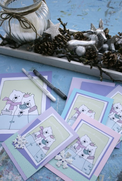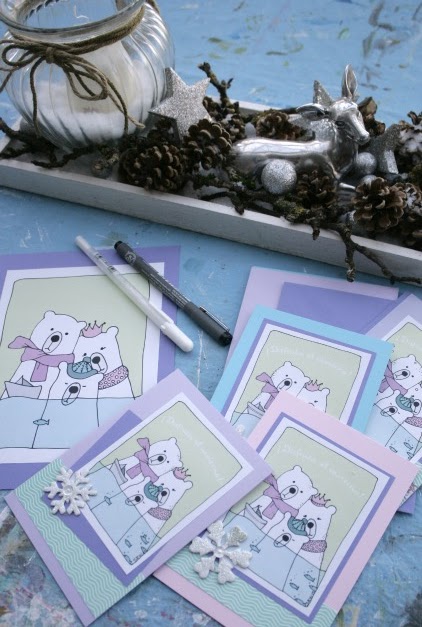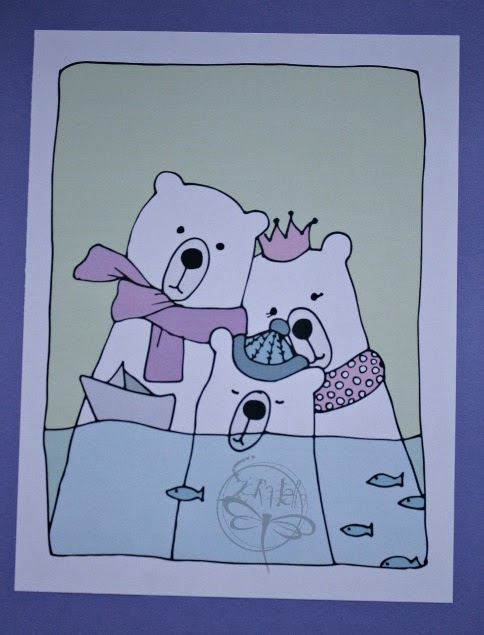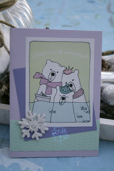 Cuando por fin me puse manos a la obra pensé que no quería copiar unos osos cualquiera, y preferí hacerme un dibujo de una familia, la idea fué tomando forma, y ya dibujándo mis osos pensé que los quería blancos (clásicos-polares), asi que como necesitaba colores, había que poner "accesorios", ves? así se van dando las cosas, por las necesidades...