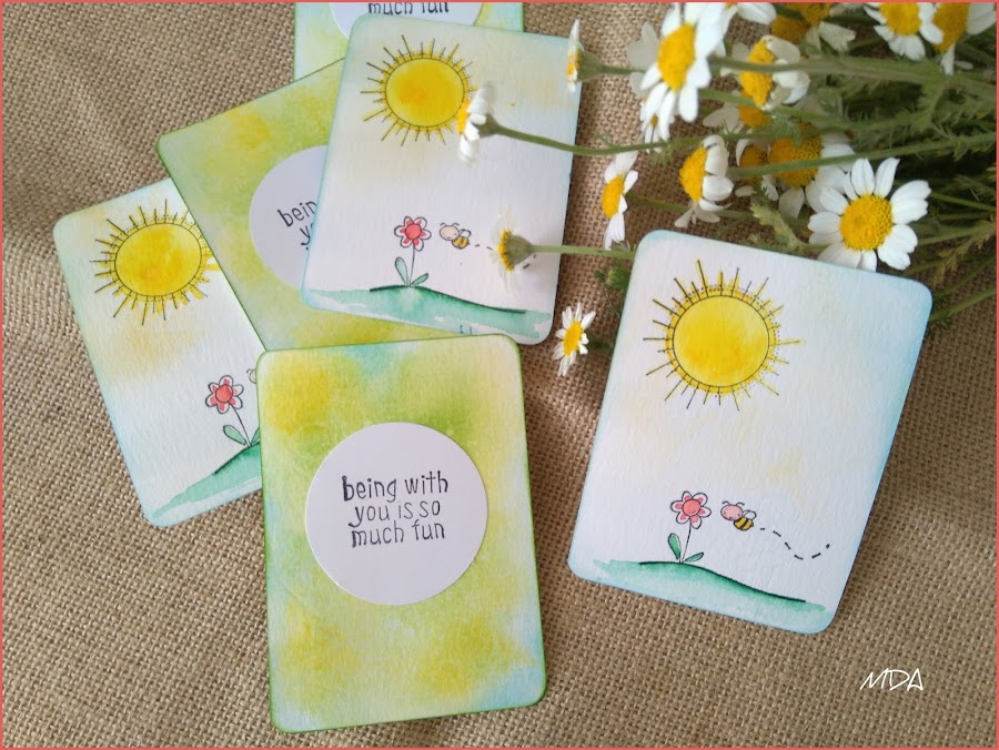 Las traseras de esas tarjetas tienen un aire más de campo, para lo que he usado tonos verdes y amarillos.