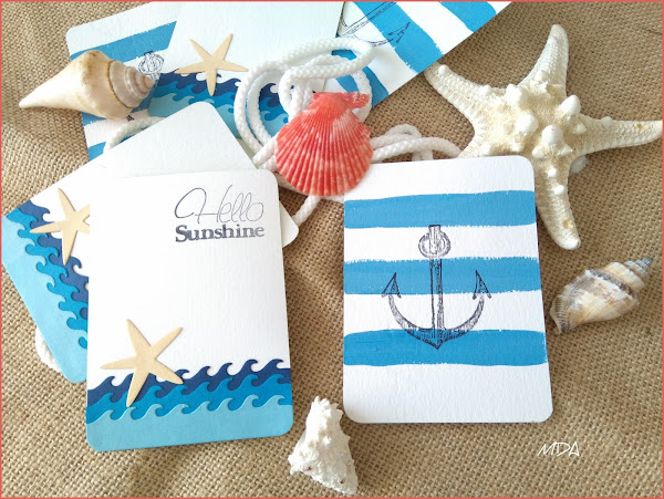 La cara delantera, como podéis ver, de estilo náutico, olas troqueladas en distintos tonos de azul o anclas estampadas sobre rayas turquesa, realizadas con pintura acrílica, son los materiales que he utilizado siempre sobre papel de acuarela.
