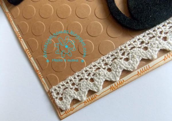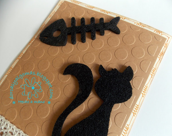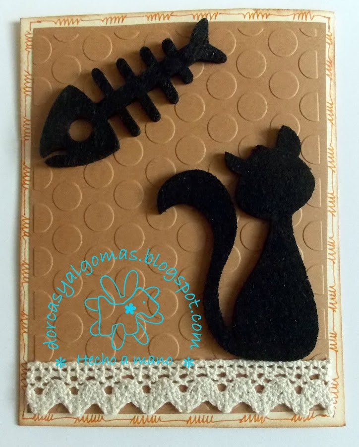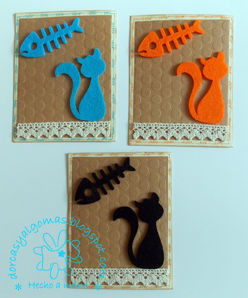 En esta ocasión ha que realizar un proyecto de scrap con el tema "Animales". Yo he realizado tres tarjetas de felicitación infantiles con unas siluetas de fieltro de gatitos y raspas de pescado.