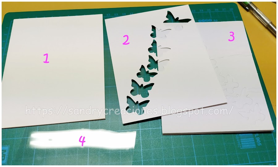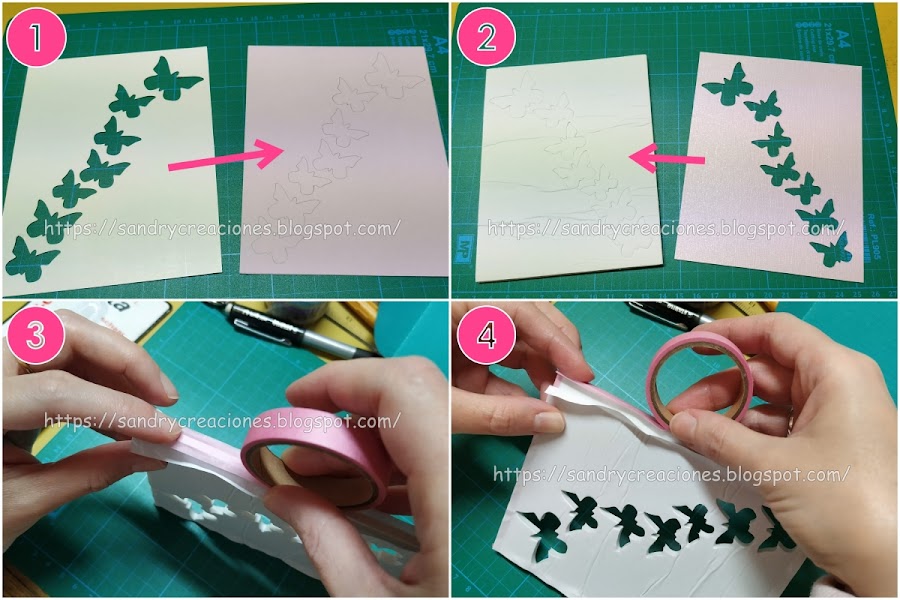 Como ya os hemos dicho la podéis personalizar a gusto de cada uno, por eso, nosotros os enseñamos como la personalizamos nosotros. Para empezar nos decidimos por decorar la tarjeta troquelada que va en la parte más superior pero en vez de decorar la que nos daban nos inclinamos por calcarla en un papel de scrap que nos gustaba más (imagen 1), con mucha paciencia fuimos troquelando las mariposas con la ayuda de un cúter y tras esto, ya la teníamos lista para cuando fuera el momento de ponerla encima de la placa de foamy (imagen 2).