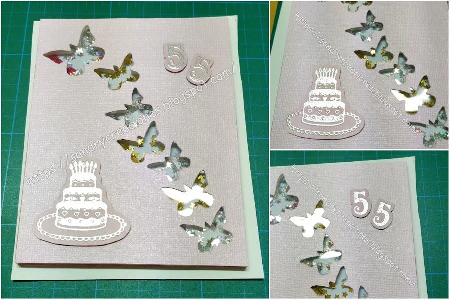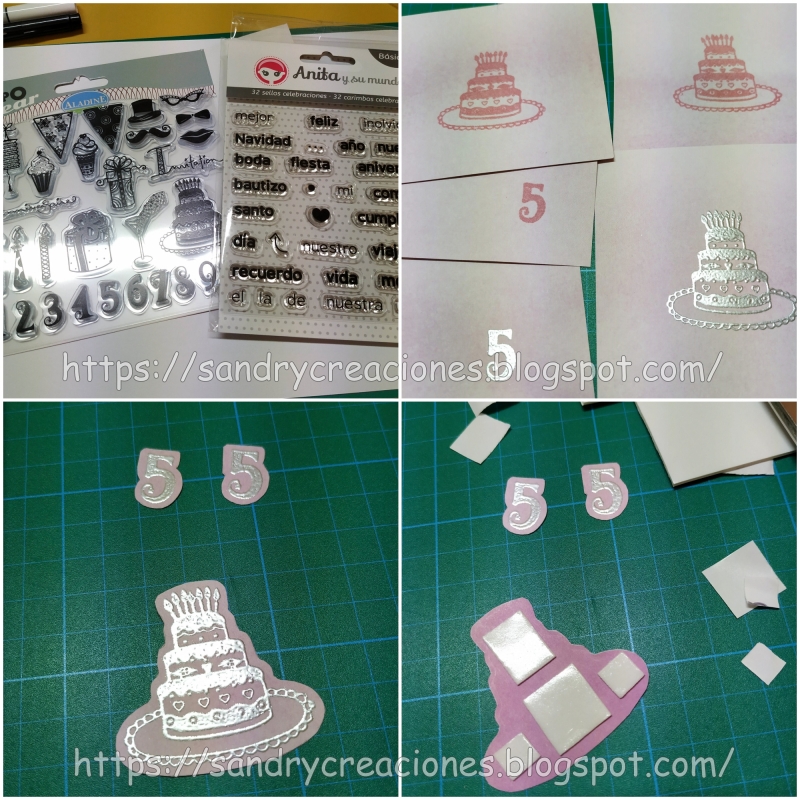 A partir de aquí ya podemos pegar la estructura rellenable a la tarjeta pero seguimos decorándola con algunos detalles más. Para hacerlo nos decantamos por la técnica que ya os hemos mostrado algunas veces de embossing, escogiendo sellos con motivos de cumpleaños o de cualquier otra ocasión. Nosotros elegimos el sello de un pastel y los números de los años de la persona destinataria. Los hicimos en dos colores (rosa vintage y plateado) para ver que efecto daban sobre la cartulina rosa escogida y al final nos decantamos por el plateado combinando así con las lentejuelas con que rellenamos las mariposas. Seguidamente recortamos los motivos escogidos por su alrededor dejando medio centímetro y los pegamos a la portada de nuestra tarjeta con cinta de doble cara con volumen, para darles un poco de efecto 3D.