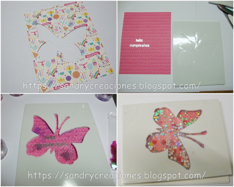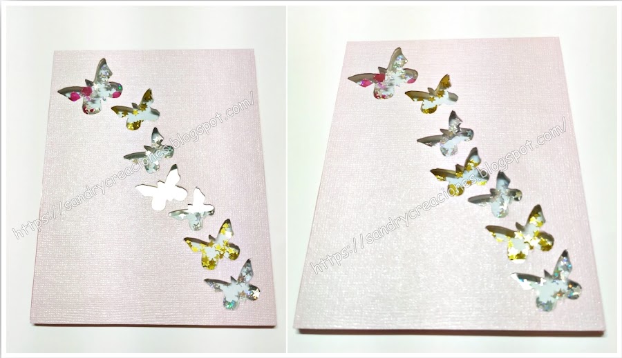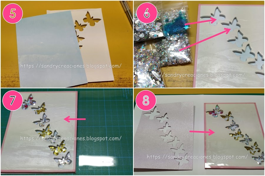 Una vez tuvimos embellecido los lados de la placa de foamy teníamos dos opciones o pegarla ya en la tarjeta por uno de sus lados o bien confeccionarle con una cartulina una base para pegarle y después pegarla a la postal. Si, ya sabemos que este paso nos lo podíamos ahorrar pero preferimos hacerlo así para poner un fondo que nos gustara y para que cuando lo pegáramos a la tarjeta tuviera más cuerpo. Así que escogimos una cartulina azul como base de la placa de foamy y fondo de nuestras mariposas troqueladas (imagen 5). Una vez pegado ya podíamos pasar a rellenar nuestras mariposas (imagen 6) y para hacerlo podéis dejar el papel que cubre la parte auto adhesiva o quitarla. Nosotros preferimos quitarla porque con otra que probamos lo retiramos una vez teníamos llenos los agujeros y al moverlo se nos esparramaba todo, así que esto a gusto que cada uno. Una vez llenas pegamos la lámina de acetato (imagen 7) y con pegamento de scrapbooking pegamos la tarjeta troquelada que habíamos preparado con papel/cartulina de scrapbooking rosa (imagen 8).