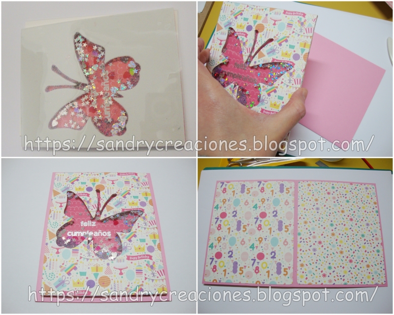 Una vez pegados todos los motivos ya tenemos la parte de delante de la tarjeta terminada. La parte de atrás la podemos dejar tal cuál o también decorarla. Nosotros ya que estábamos puestos tuvimos ganas de decorarla también y en la parte de atrás troquelamos otro papel/cartulina de scrap con mariposas y la pegamos así tal cual porque nos gustaba el contraste que quedaba con el papel/cartulina de la postal. Y ya tendríamos la parte exterior de nuestra tarjeta, en nuestro caso felicitación de cumpleaños, terminada:
