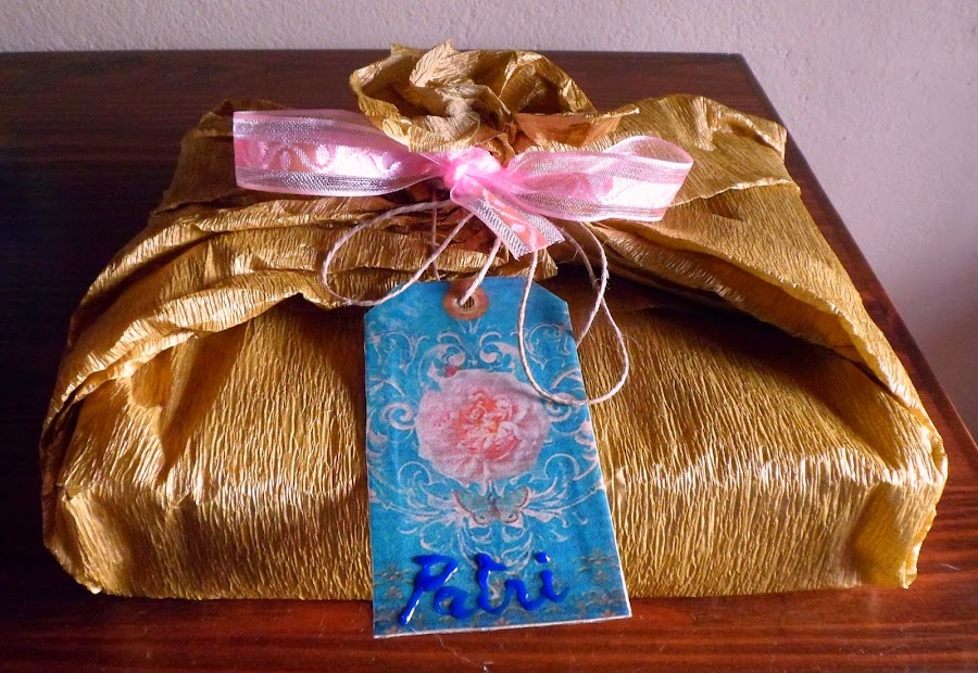 Como papel de regalo he utilizado distintos tipos de papel que tenía de sobra de otras manualidades, resulta más económico y original que el típico papel de regalo. En este caso se trata de papel de seda rosa, anudado con hilo de cáñamo y formando una rosa en la parte superior del papel.