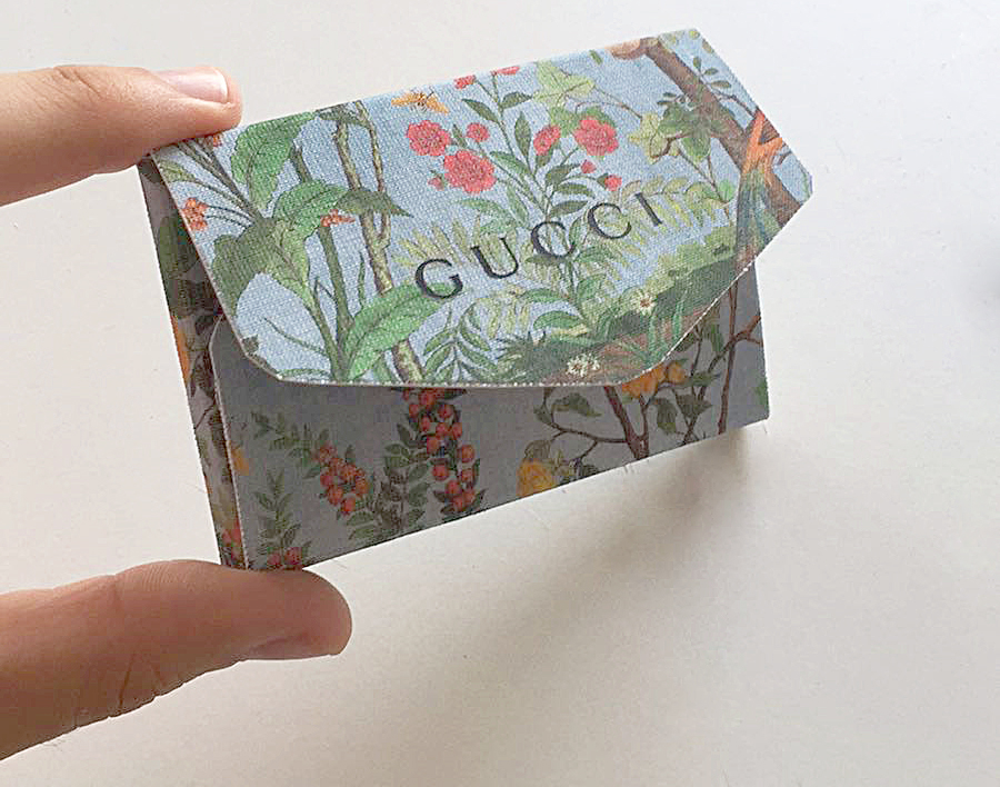 La cosa es muy sencilla, sobre el cartón forrado con la tela recortamos la forma del tarjetero desplegado, cuidado con medir bien y que luego quepan las tarjetas... ojo también si queremos que algo salga en una posición en concreto, nosotros queríamos el logo de Gucci en la solapa superior por ejemplo.