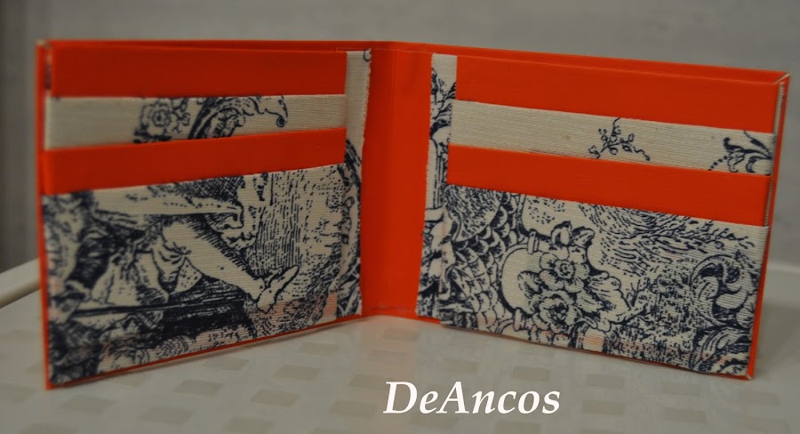 Por dentro, los bolsillos del tarjetero están forrados en el mismo guaflex alternando con tela de Toile de Jouy en color azul para que hiciera juego con el naranja.
