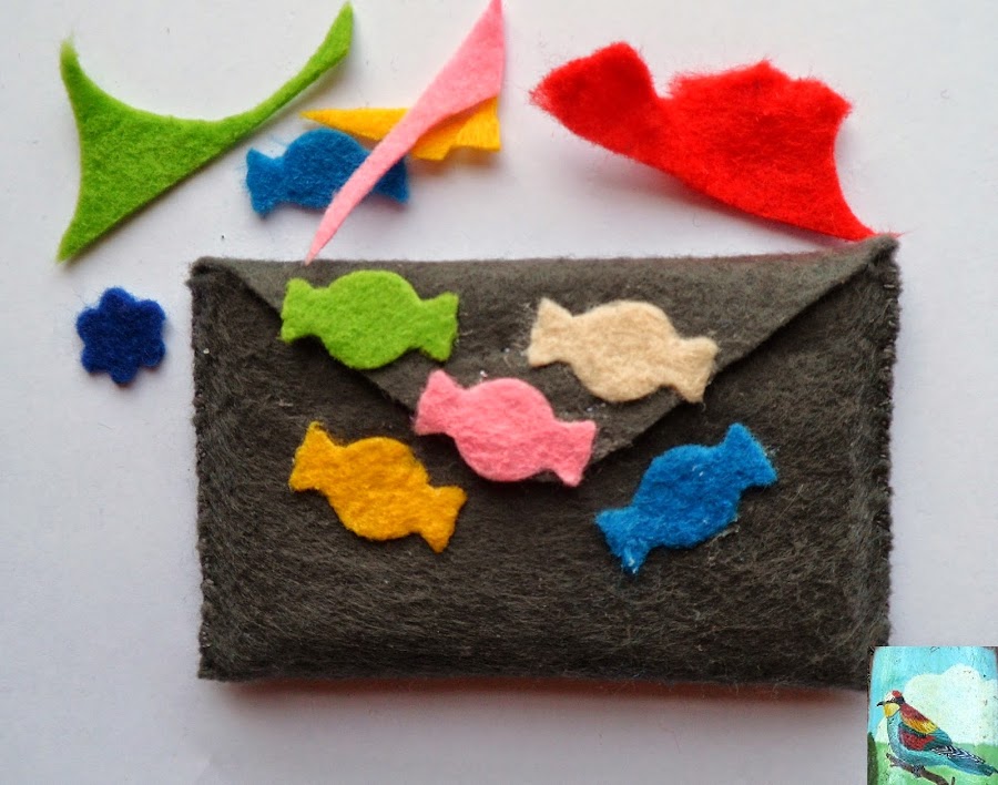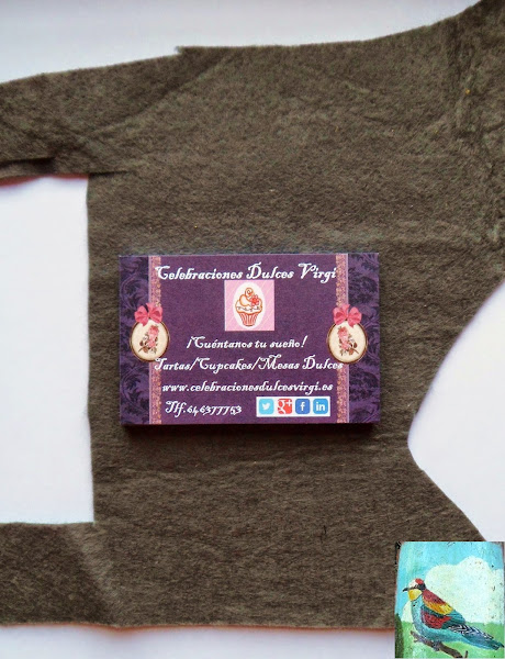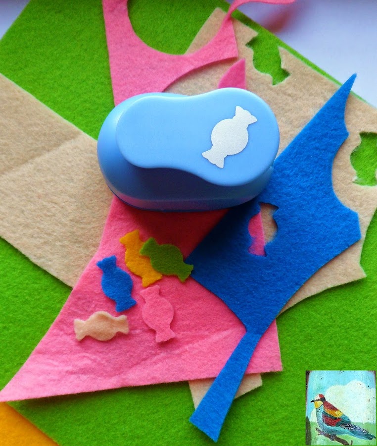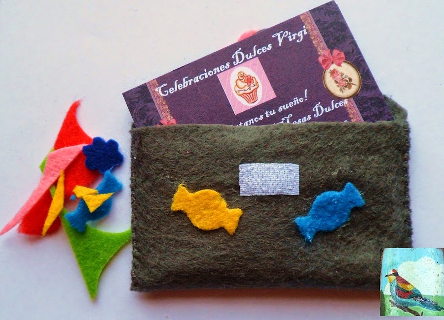 7. Bueno el tarjetero ya está, ahora sólo falta la decoración. Como mi intención es usarlo para llevar las tarjetas de visita de Celebraciones Dulces Virgi, he optado por una decoración igualmente dulce y he hecho con mi troqueladora caramelos en fieltro de distintos colores.