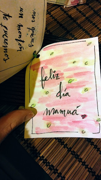 y que mejor cosa que hacer una tarjetita para mi mamuchi, mi bolita de billar, con la ilustración del "altillo de los duendes" y una florecilla silvestre de madera