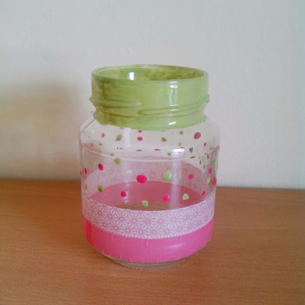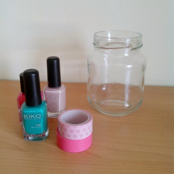 Los materiales que necesitamos son: un tarro de cristal reciclado, washi tape y esmalte de uñas.