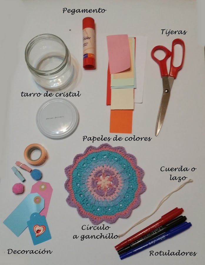 Yo como pienso con mi mente ganchillera lo primero que he visto ha sido un tarro decorado con ganchillo y me he puesto manos a la obra.