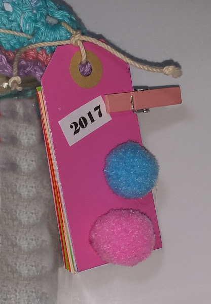 He sujetado los papelitos a la tarjeta con una pequeña pinza y con otro trozo de cuerda los he atado al circulo de ganchillo (así los tendremos siempre a mano).
