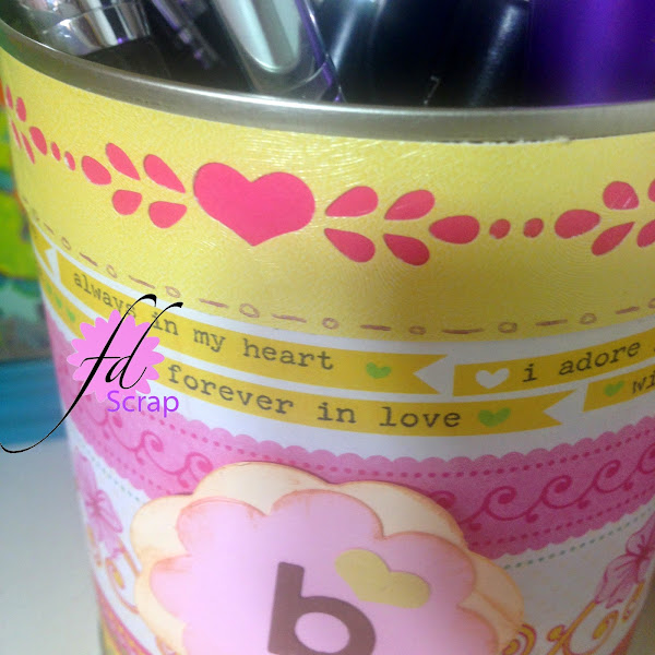 Para forrar la lata he usado papel scrap con cinta doble cara, los colores muy veraniegos para que hagan juego con las cajoneras que tengo atrás.
