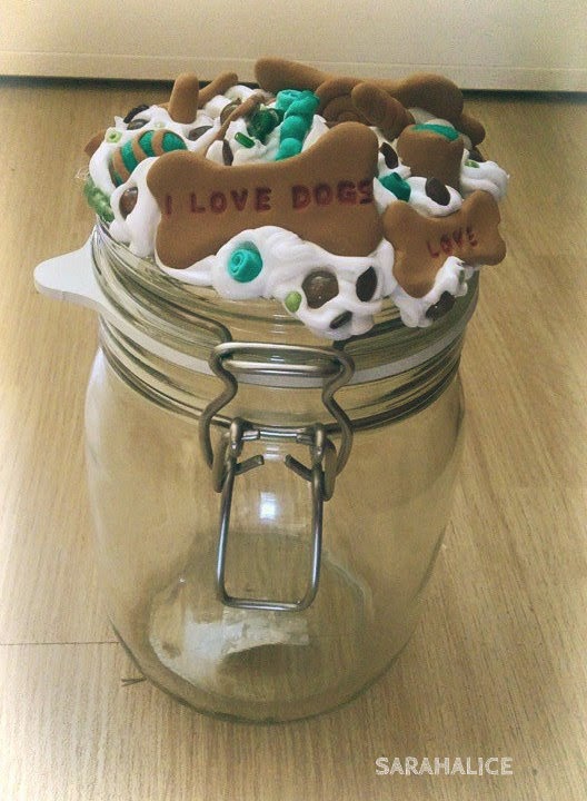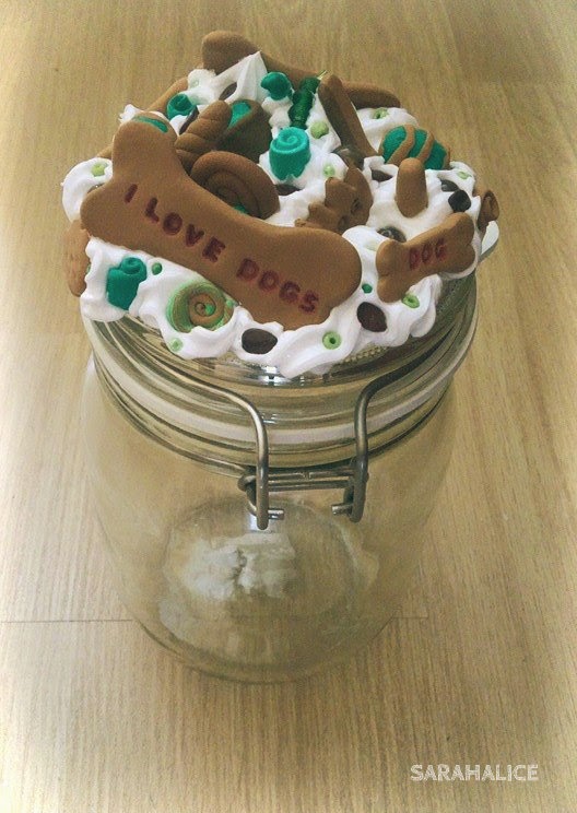 Todos recordáis nuestros tarros y cajas dulces, no?. Pues estos tienen el mismo proceso, pero en vez de hacer y utilizar galletas "humanas", hemos plasmado galletas de perro junto a la nata.