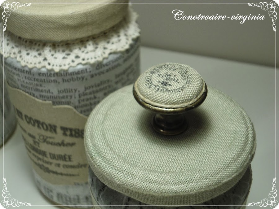 Este pomo tenía la parte superior de porcelana pintada, como no me gustaba, también lo forre con tela y le estampe un sello con tinta stazón. Para el remate pegue un poquito de cuerda con cola.