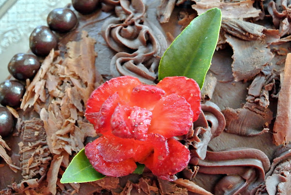 Para decorar por encima puse fresas cortadas en forma de rosa como veis abajo. Os dejo un tutorial aquí.