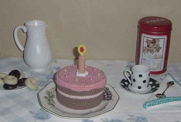 MONTAJE Tenemos la parte del bizcocho, la cobertura, la vela, la nata y la caja. Ahora metemos la caja dentro de la parte marrón (tiene que tener la misma altura) y tapamos con la parte rosa. Cosemos por el interior la base a la última vuelta que hicimos en la cobertura con 78 puntos, los mismos que los de la base, uno a uno. Justo en el centro ponemos la nata y en el agujero que ha quedado metemos la vela (puedes coserlo todo o introducir un palillo en la vela y luego atravesar la caja con él y así se quedará sujeto, así se puede quitar y poner), de esta manera puedes usar las tarta para muchas ocasiones…
