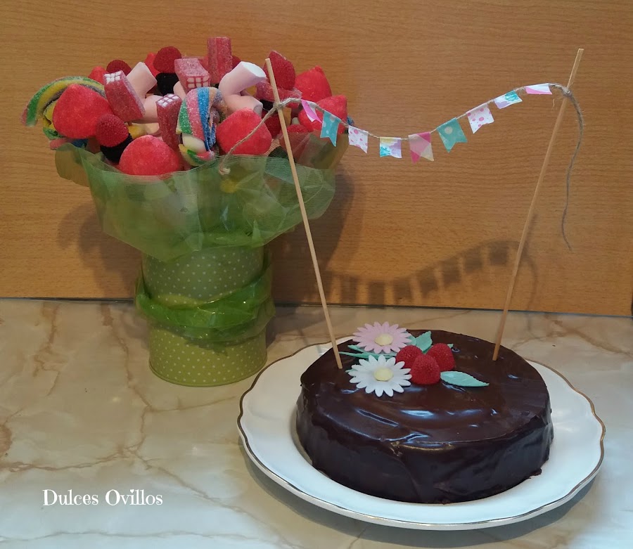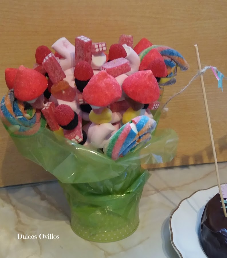 Las chuches no podían faltar, sobre todo para los que no comen chocolate. Aunque todos se pusieron las botas, incluida yo que estoy a dieta. Hice un ramo pinchando las chuches en las brochetas. Las brochetas se sostienen en una lata bonita llena de azúcar. Me encantan las latas, a veces las compro independientemente de lo que lleven dentro ;). Esta lata verde con lunares es de LaCasa, la compré estas Navidades y venía con unas trufas.