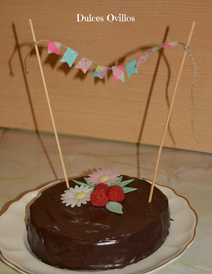 La tarta es la misma que la del año pasado. Y es que no la puedo cambiar, porque es la que le gusta al niño. Si vas al post de febrero16 encontrarás detalles para su realización. Esta vez la he adornado con unas Margaritas de oblea de Dr. Oetker y unas moras de chuche. Le he añadido también un topper de banderitas, hecho con washi tapes, dos brochetas y un trozo de cuerda.