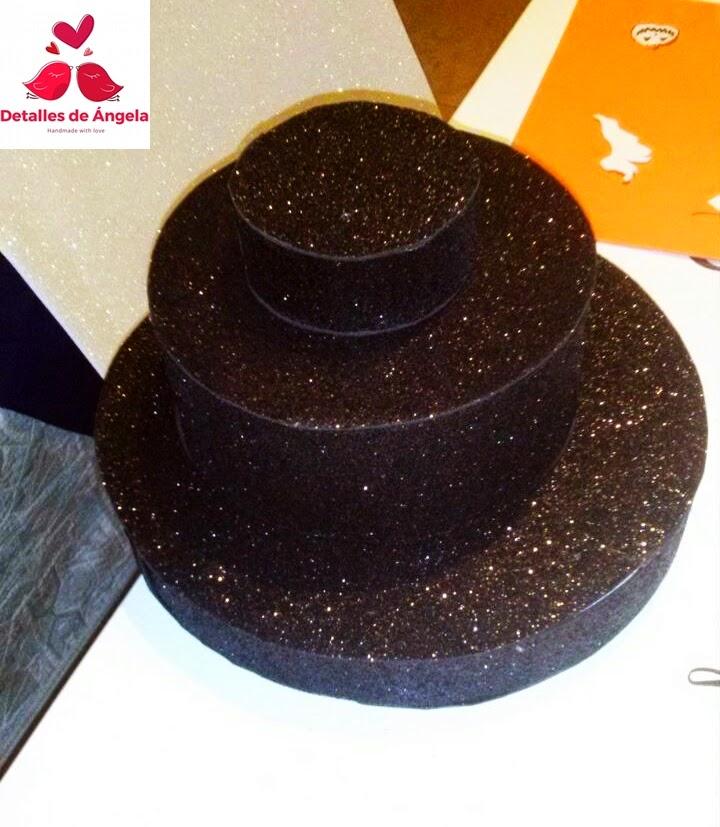 Forramos los tres pisos (las partes de abajo de los círculos pequeño y mediano no hace falta forrarlas ya que no se van a ver. La parte de abajo del círculo grande la forramos dándole la vuelta a la goma eva para que nos quede por el lado liso). Nos queda así: