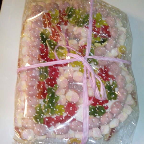 Por último, coloca papel de celofán y un lazo, que además de para decorar y transportar mejor la tarta la conservará para que las gominolas no se estropeen.