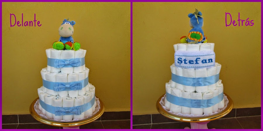 Son una serie de regalitos que le he hecho a una amiga. Lo primero es una tarta de pañales (ya que está esperando un bebé), a la que le he añadido un peluche-sonajero y un pechito con el nombre del bebé bordado. Se puso supercontenta cuando la vio, le hizo muchísima ilusión. Mirad qué bonita: