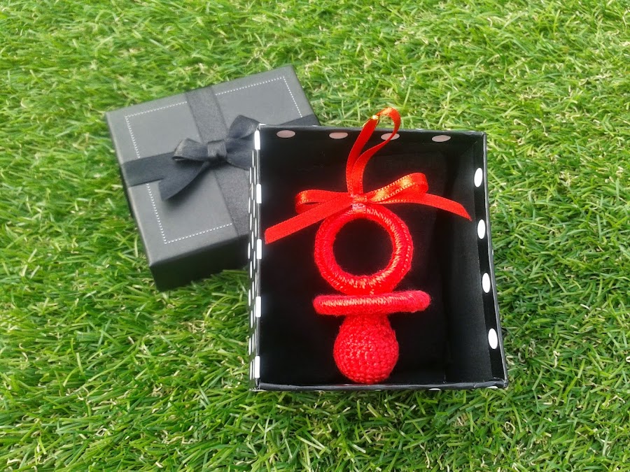 Además, también le quise hacer un chupete de ganchillo con un lacito rojo para colgar en el carrito del bebé, quedó muy bonito con su cajita: