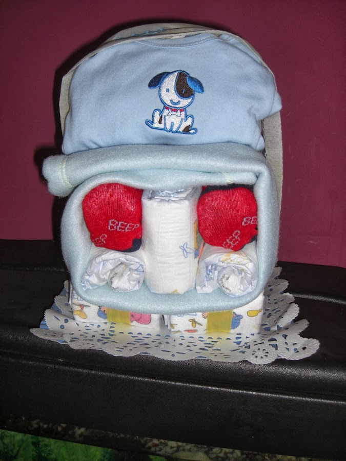 Blanca es la niña de Pedro, y todos sus compañeros quisieron hacerle una regalo de bienvenida a su peque. Dijimos de hacerle una tarta de pañales, ya que, quedan muy bonitas y sobre todo es una ayuda de algunas cositas que se necesitan en sus primeros momentos.!! jajaja Le pusimos todo lo referente al aseo del bebe y añadimos un babero, un saquito guarda chupete con el chupetero y un neceser que l ...