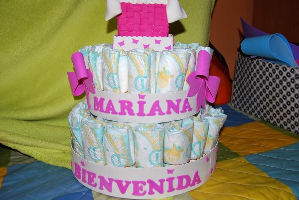 Tarta de pañales como regalo original para un nacimiento Realización: Está realizada con pañales y productos del mercadona,sobre una base de tartas vamos colocando los pañales enrollados y sujetos con una goma cada uno,podemos hacer los pisos que queramos y tapar las gomas con cinta de lazos para regalos por último lo envolvemos en papel transparente sujeto con cinta más pequeña ( todas las cinta ...