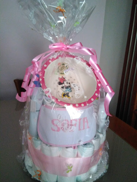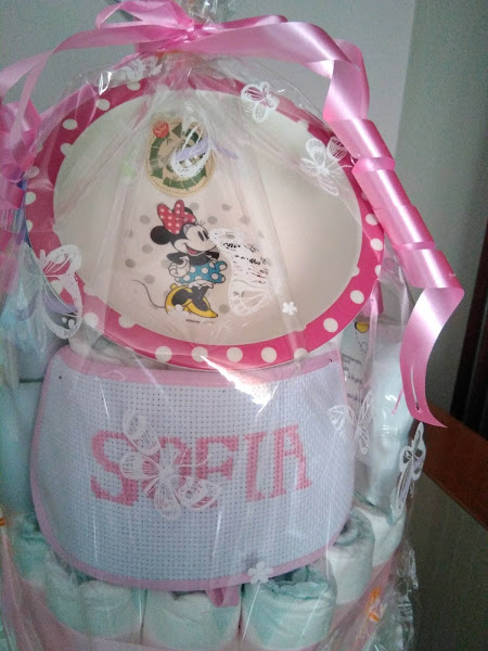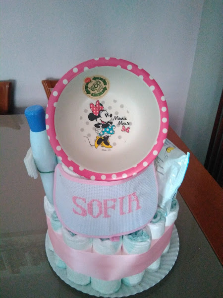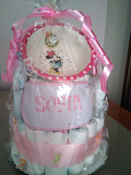 Hola amigos y seguidores del blog, hoy seguimos con las tartas de pañales, en esta ocasión me han encargado una tarta de pañales, para el feliz nacimiento de Sofia,