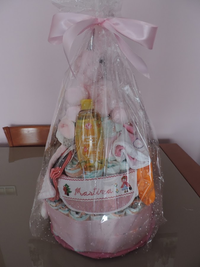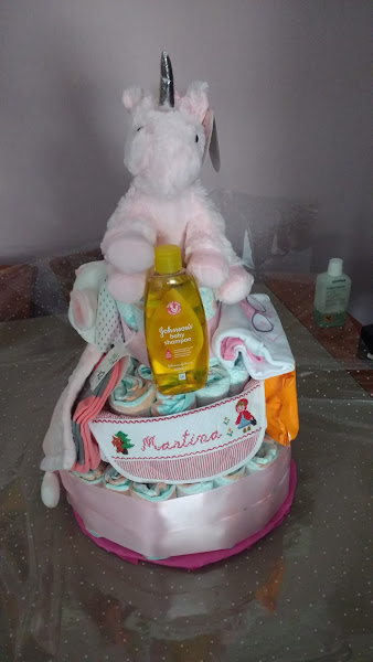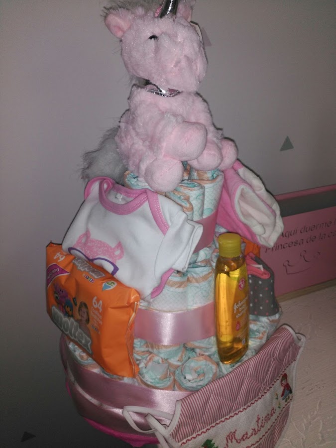 La tarta la he acompañado con un pijama, un body, calcetines, un babero bordado por mí a punto de cruz, puedes verlo aquí le he puesto también una mantita de estas con un muñeco que usan los bebés para dormir, también lleva la colonia, el champú, 2 paquetes de toallitas, y un peluche que es un unicornio rosa.