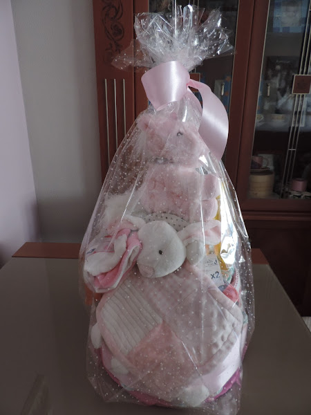Bueno, le he preparado una tarta de pañales, es la primera que hago, y me ha gustado mucho hacerla y como ha quedado, (bueno aunque puede mejorar, lo sé, jejeje).