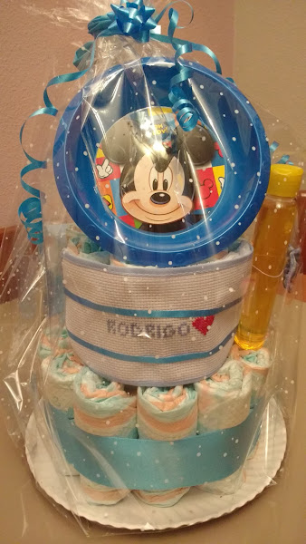 Las tartas llevan aprox. 30 pañales de dodot talla 3, babero, gel o champú Jonhson, esponja de baño, toallitas y arriba está decorada con un platito de Mickey Mouse, o peluche a elegir.