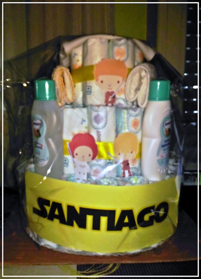La tarta se compone de un paquete de pañales de la talla 3, cuatro botes de 200 ml (colonía, gel, champú y crema), 2 baberos y un body personalizado.