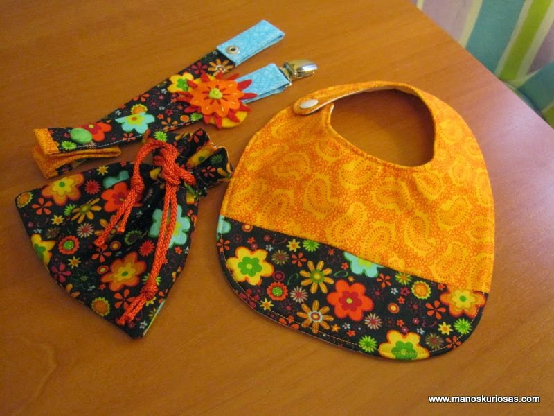 Le pusimos todo lo referente al aseo del bebe y añadimos un babero, un saquito guarda chupete con el chupetero y un neceser que lo hicimos todo haciendo juego entre sí.