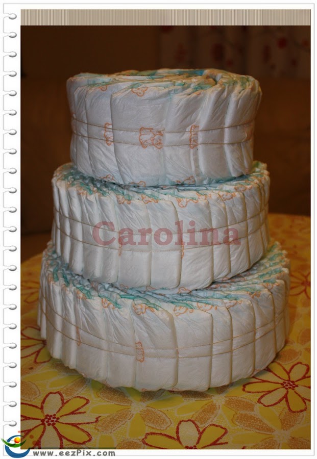 Para un pastel de 3 alturas, en la base pondremos 48 pañales, en el medio 32 y en la parte más alta 16.
