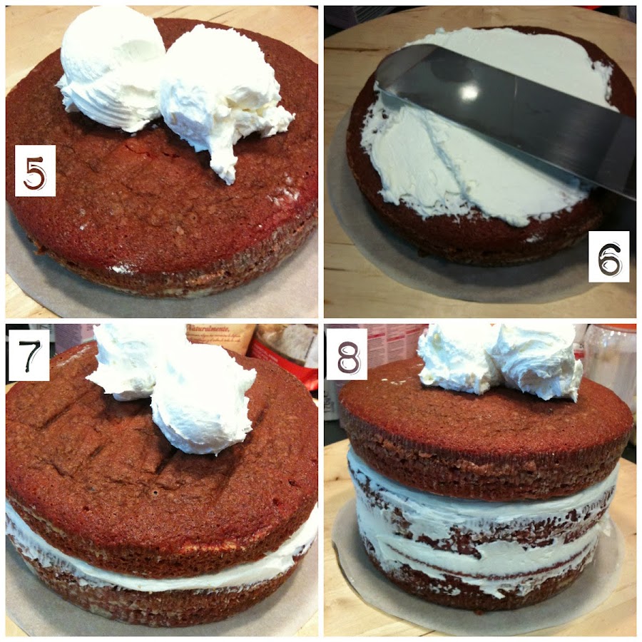 8.- Poner la tercera capa de bizcocho y repetir los pasos 5 y 6.