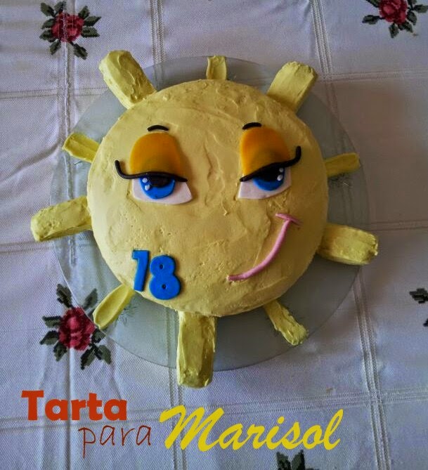 Pues sí..... un Sol para Marisol... jajaja... Su marido (Inda) dijo.... he pensado en que la tarta sea un Sol.. y digo... cómo no se me había ocurrido a mí!!!! yo pensaba en flores... mariposas... así que me alegro que lo tuviera tan claro porque ha quedado muy chula....