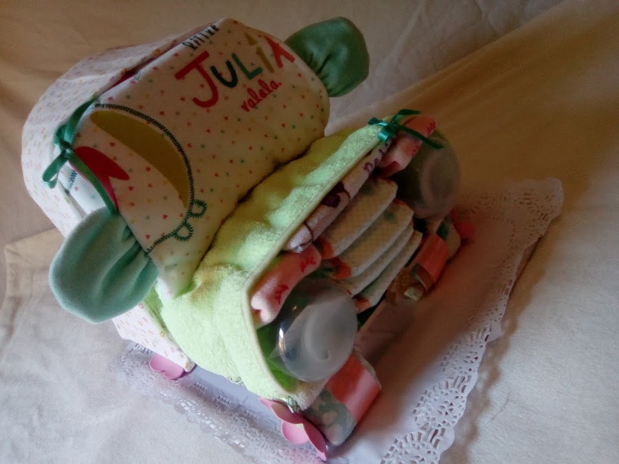 Hace unos meses, contactó conmigo Gema, desde Alicante, quería un coche de pañales igual a uno que publicamos hace ya algunos añitos, pero como no hay dos tartas iguales, porque cada detalles es único y especial, éste fué el resultado.,