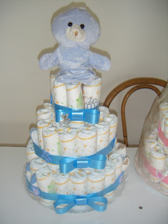 Tartas de pañales para regalicos a los recién nacidos, por ahora he hecho tres... espero seguir haciendo muchas e ir mejorando :)) para la próxima se me ha ocurrido que en vez de hacerlas sobre bandeja de cartón con blonda, las podía hacer sobre una cesta de mimbre de esas no muy altas y forrarla con tela de motivos infantiles o ponerle unos lazos a los lados... ya tengo ganas de hacer pronto otra :))