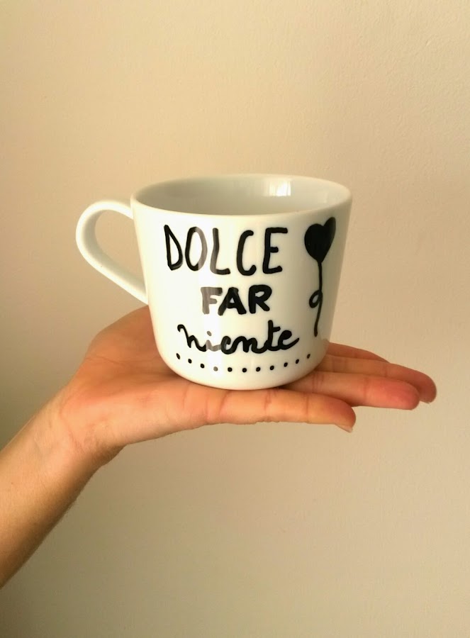 Taza + rotulador (en este caso especifico para pintar sobre cerámica. Los hay de varios colores. El precio, unos 2 euros y pico)