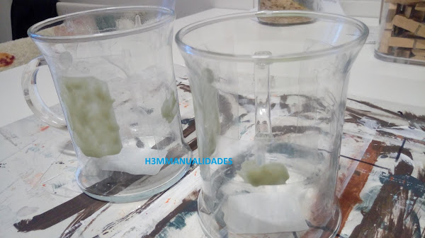 El caso es que ésta no era mi idea inicial... bueno, las tazas y las infusiones, sí, pero yo quería decorarlas grabando con ácido las iniciales. De hecho, aquí se ve todo el montaje, con las plantillas que me fabriqué y la pasta al ácido ya dada. Esperar unos minutos y ya estaría. Pero... ¡cuál fue mi sorpresa cuando vi que la pasta no había hecho el menor rasguño al cristal! Nada. Ni la más mínima señal. ¿Por qué? Pues no lo se, pero supongo que su composición será diferente a otras copas y jarrones con los que ya he probado y ya pondré por aquí. Así que... ¡a empezar de cero!