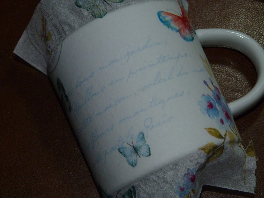 Ufffff... esto no pintaba nada, pero nada bien.Creo que hay un producto específico para decoupage en loza, que permite incluso lavarla en lavavajillas, pero yo utilicé simplemente cola disuelta en agua, y después le di una mano de barniz mate. Cuando vi la cantidad de arrugas que salieron, lo primero que pensé fue en quitar la servilleta y buscar un plan B.