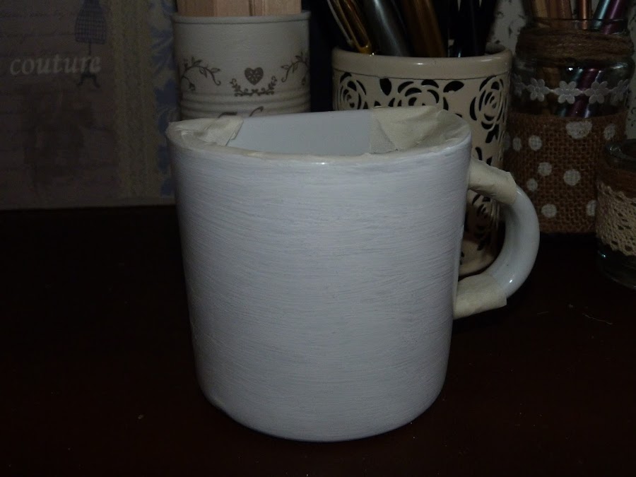 La otra taza quería decorarla de forma que pudiese hacer pareja con la primera, pero para nada que fuera igual. Así que decidí pintarla. Primero, protegí con cinta de carrocero las zonas que quería dejar blancas, y di una mano de imprimación.